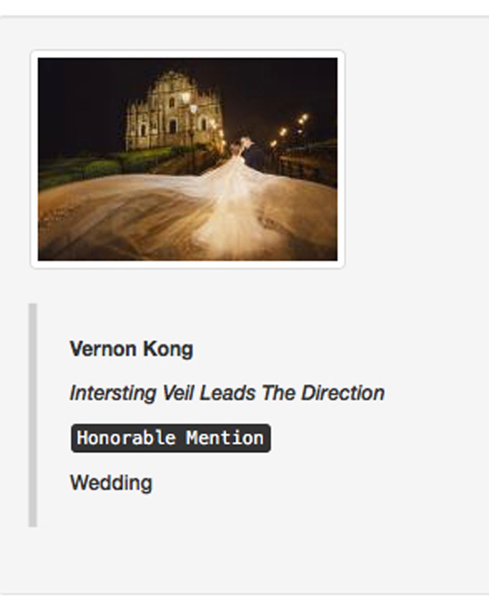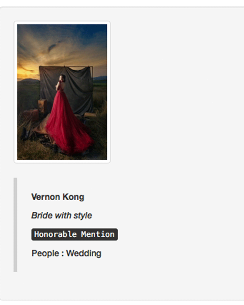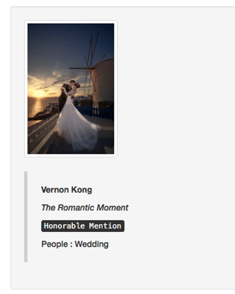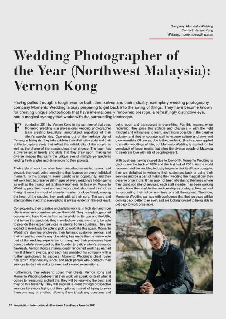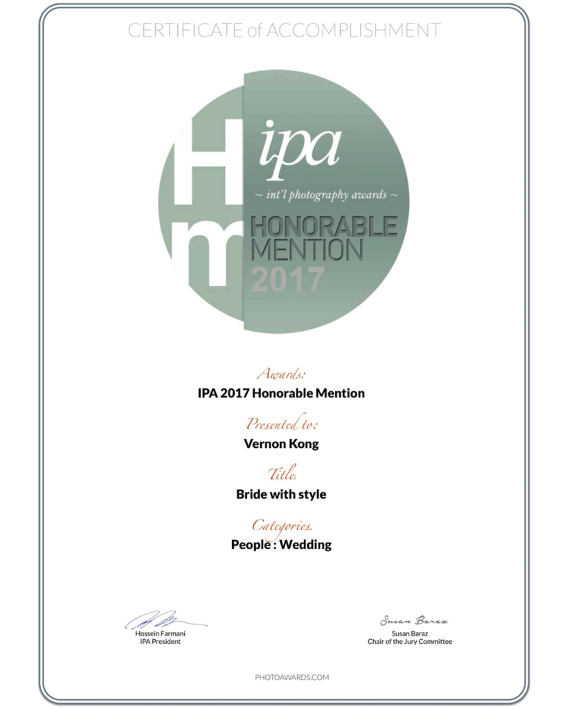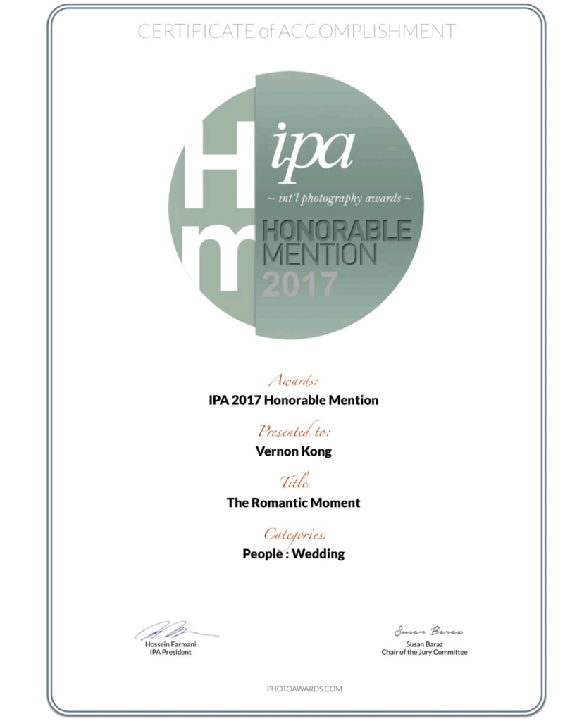 Vernon Kong received International Awards and Achievements Around The World. It is an extraordinary honour to receive the awards from overseas, which significantly shows the quality of our artwork. Vernon travels to many countries for wedding photo shoots. He always enhances the shooting style of Natural, Elegant and Stylish in the Pre Wedding shots. With the outstanding performance, he managed to get a couple of International Awards and Achievements.