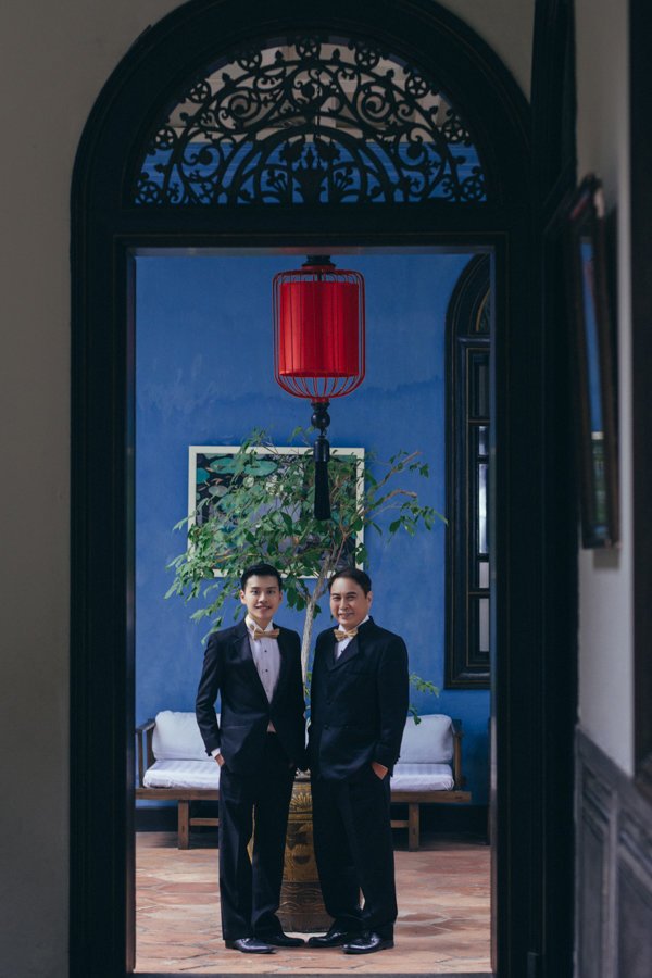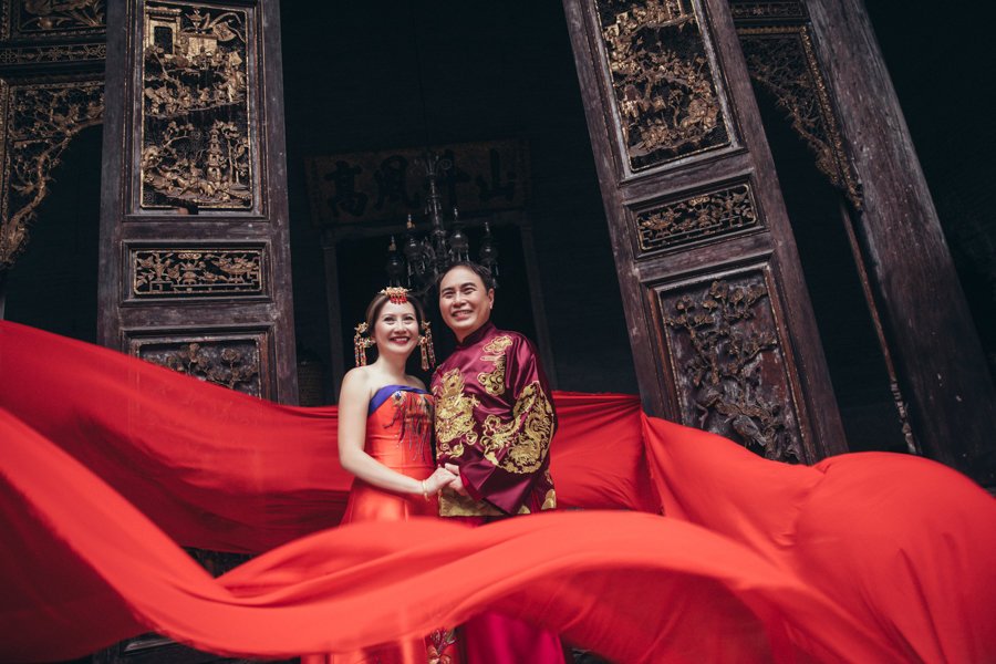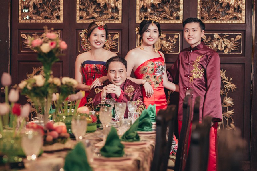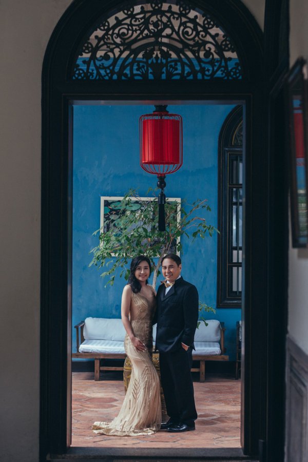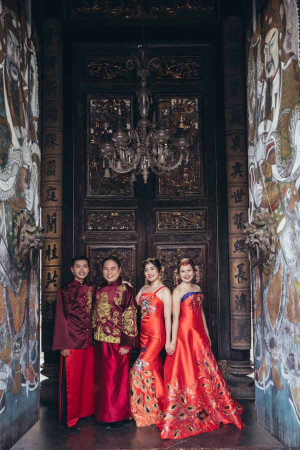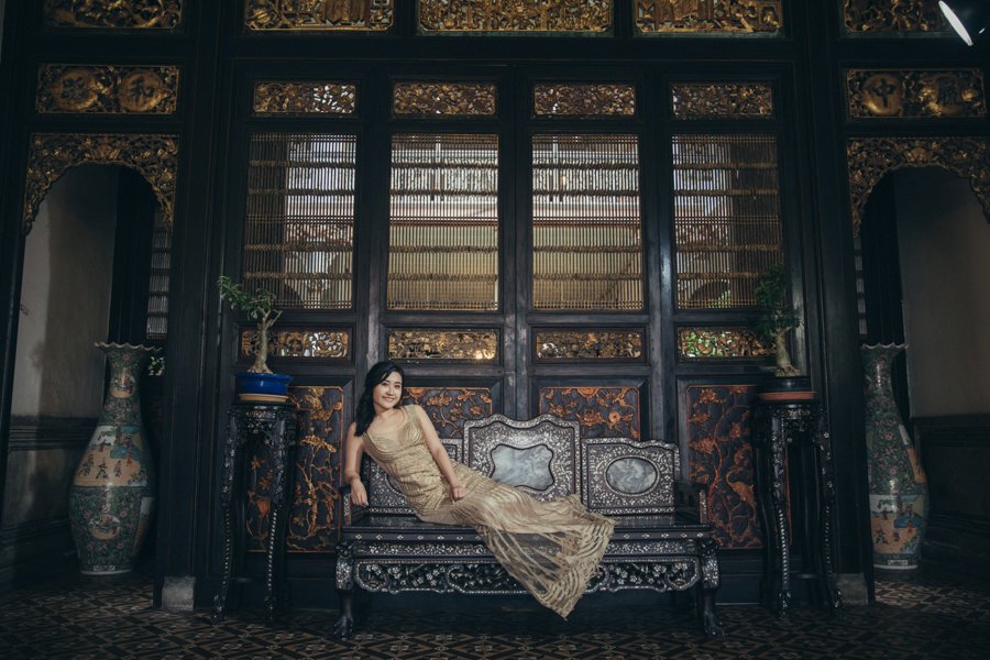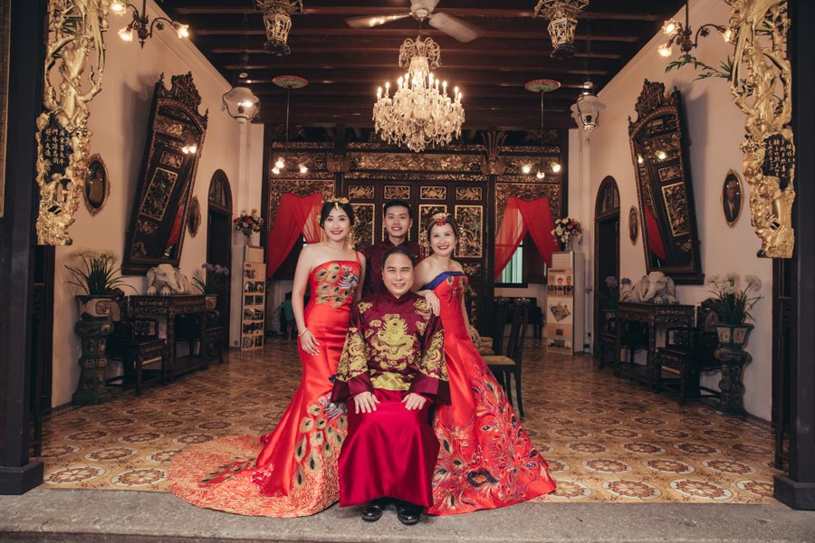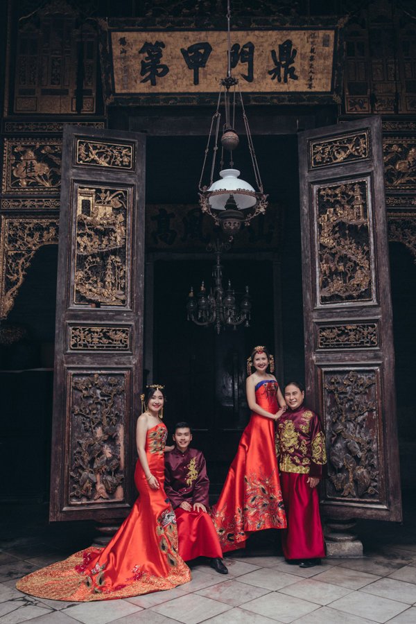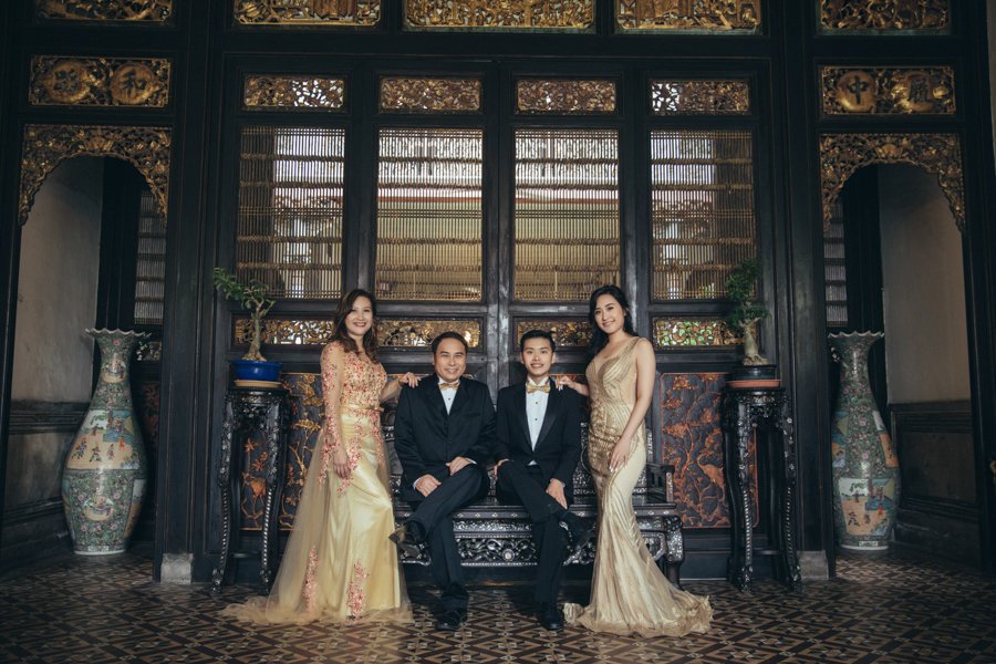 During this Family Photo, the Chengs opt for a modern family twist in an elegant setting of Blue Mansion. The ladies’ choice of gold dresses coupled with the men in black suits, really stand out in this exquisite setting. Not only that, the color just blend in beautifully with the vivid Indigo Blue building walls.